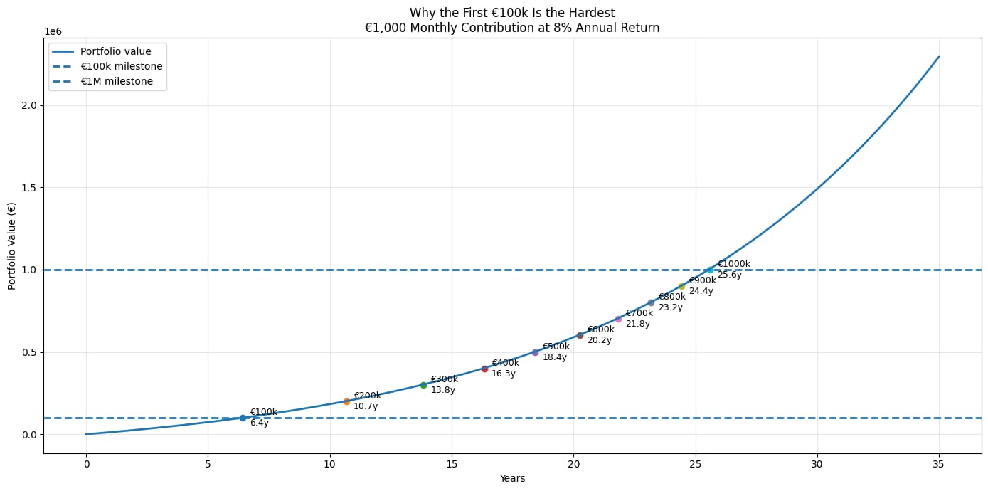 Notice the pattern: the first €100,000 takes the longest of any individual €100,000 segment, and each subsequent €100,000 requires less time. The absolute growth remains slow at first, which explains why it feels like a long climb. After about €200,000–€300,000, momentum starts to become more visible, and progress begins to feel faster.